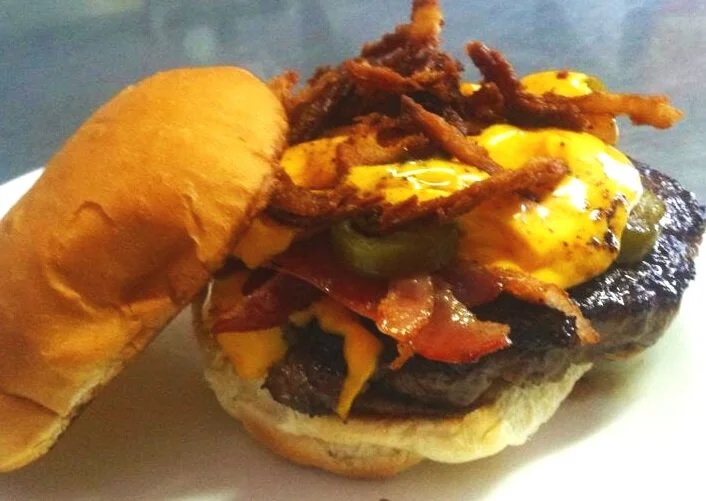 Crispy bacon, cheese, jalapenos, crispy fried onions and a beef patty on a toasted bun.